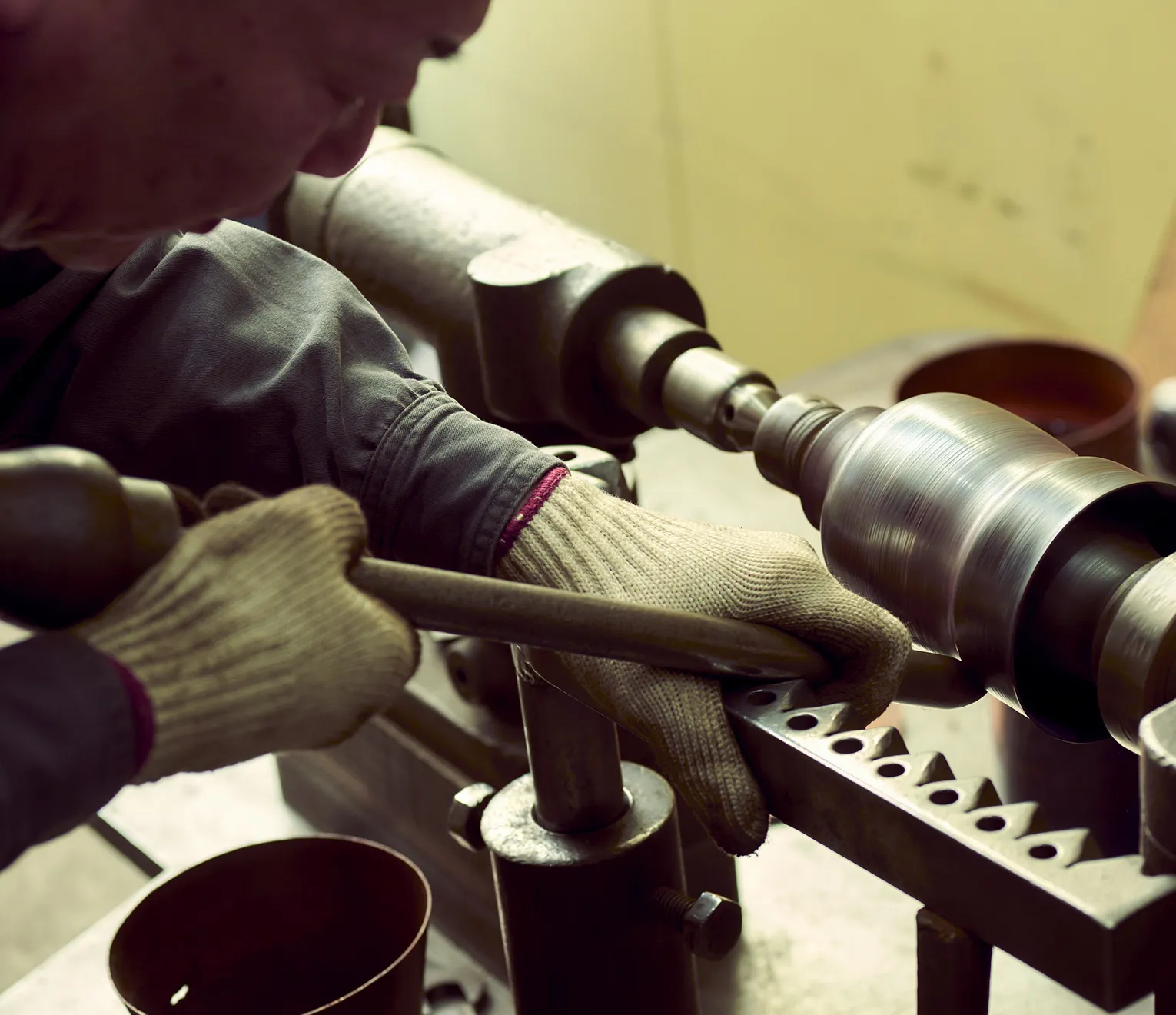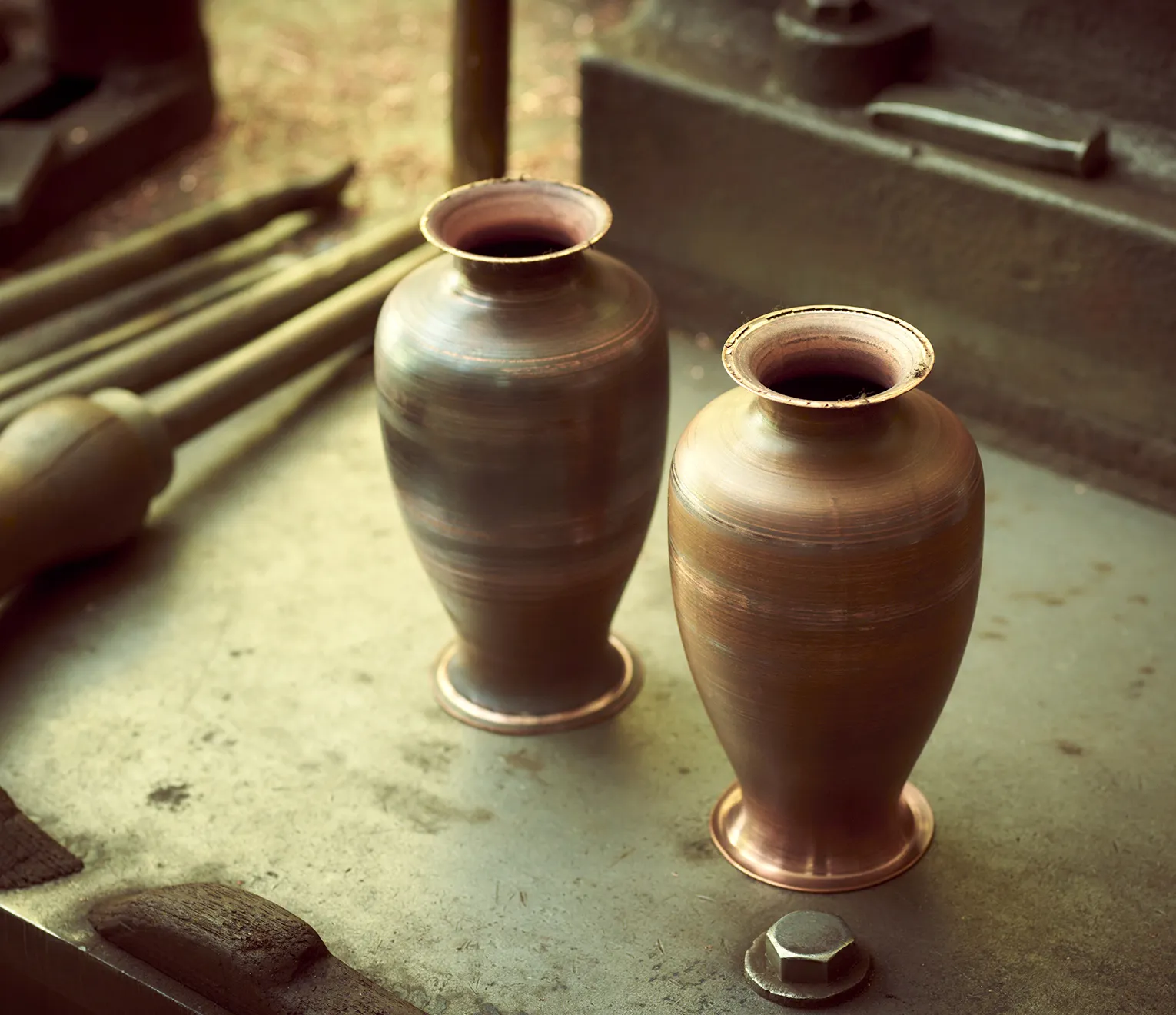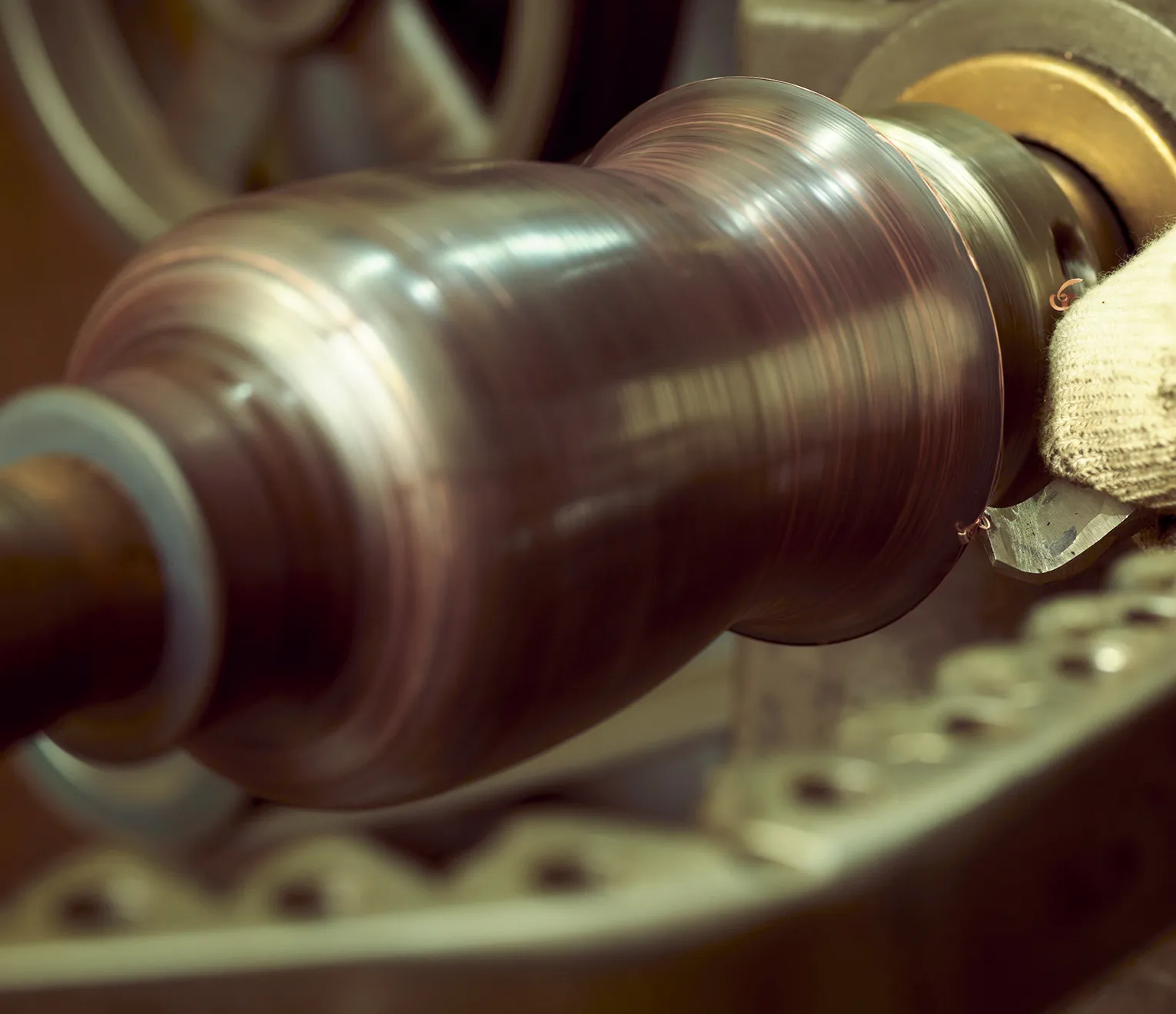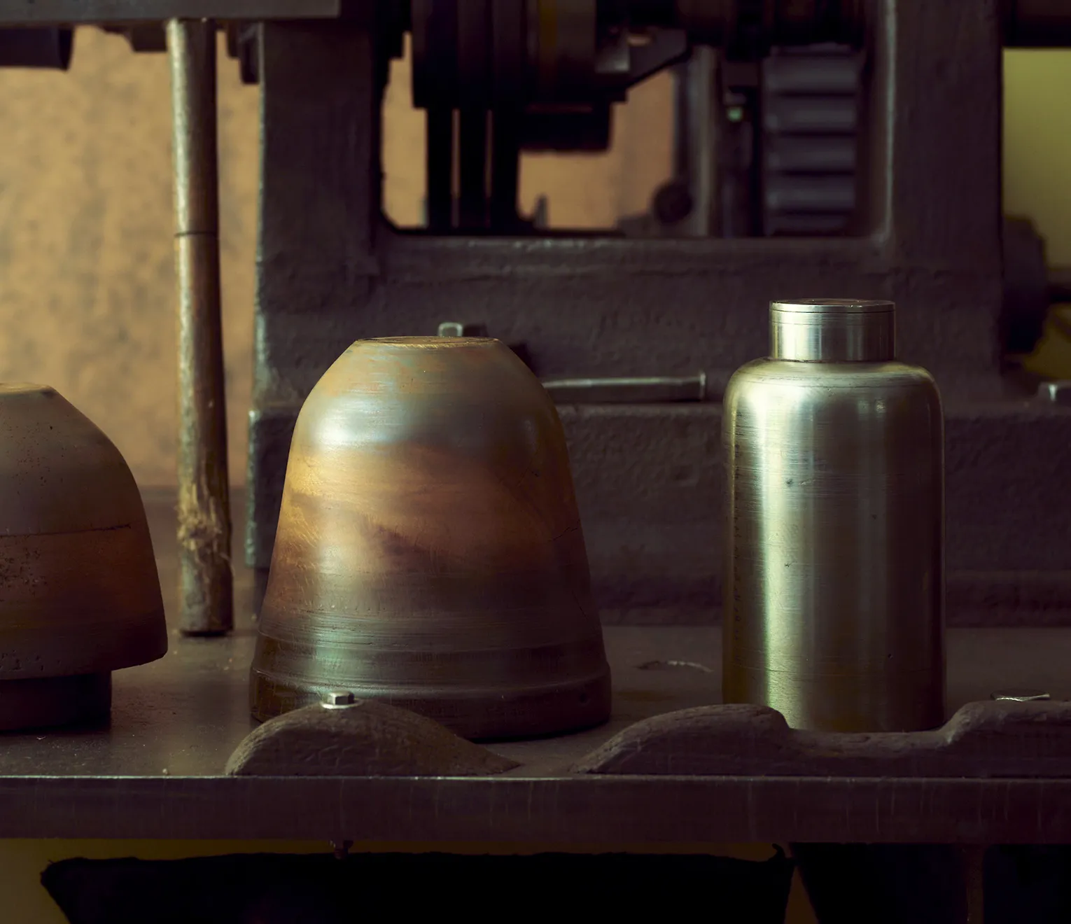 絞り旋盤と呼ばれる機械に金属の型を固定し、丸く切り出した銅板を挟み込む。旋盤を回転させたら、ヘラ棒と呼ばれる金属の棒を、テコを効かせながら押し当てていく──。ろくろを使って焼き物を形づくるかのように、平だった銅板がみるみるうちに弧を描き、花瓶の形状に姿を変えていった。