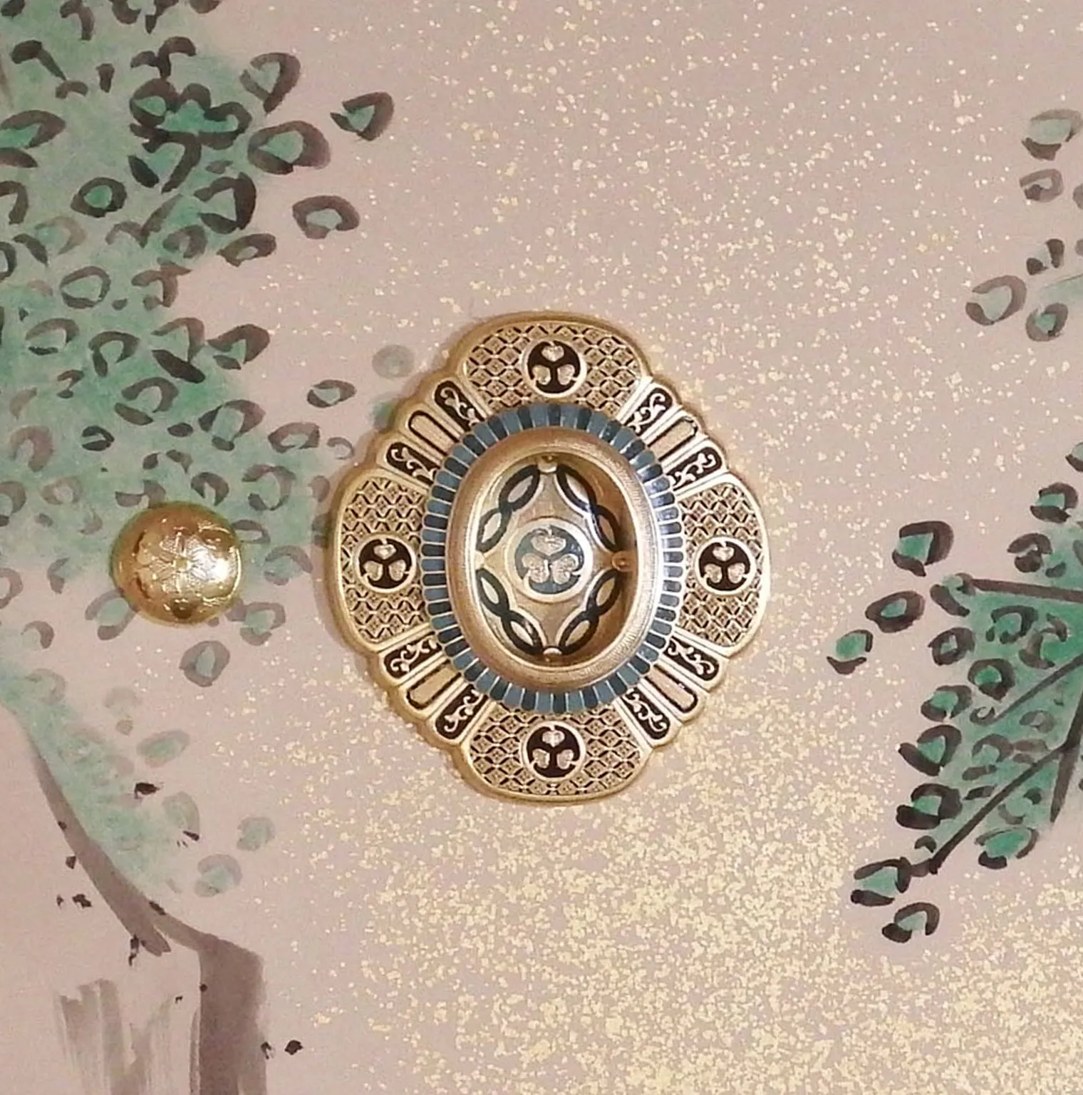 For the construction of Nagoya Castle's Honmaru Palace in 2015, we received an order to restore the cloisonne door pull handles of the Jorakuden room and the bracket fittings of the ornamental door fixtures. We were responsible for the cloisonne work in both the second and third phases of the construction. The fittings and bases came from Kyoto, and a joint venture between Ando & Hazama undertook construction.